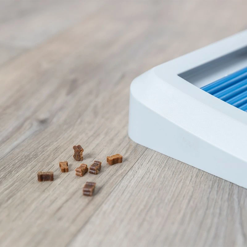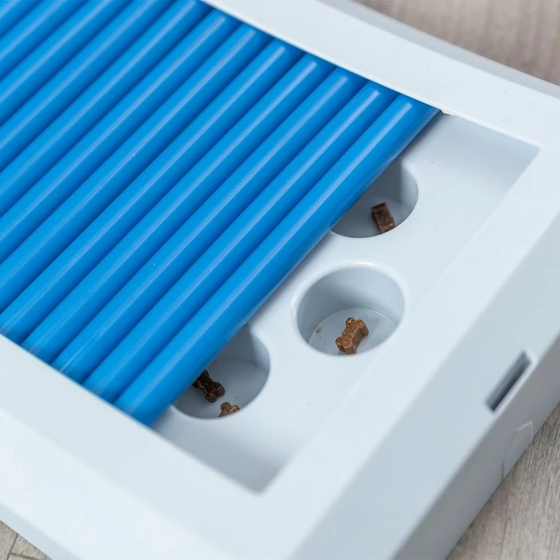 - Exciting: board game with numerous recesses for dry food and snacks, covered by multiple rods that must be moved to access the treats.