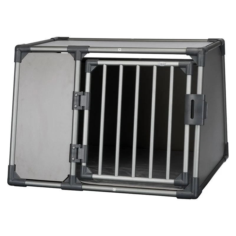 This aluminium transport crate by Trixie is a safe solution for travelling by car with your dog. The front and back sides are slanted which means that the crate fits easily into the car boot. The crate is constructed to be stable yet light (23kg) as it is made from aluminium.