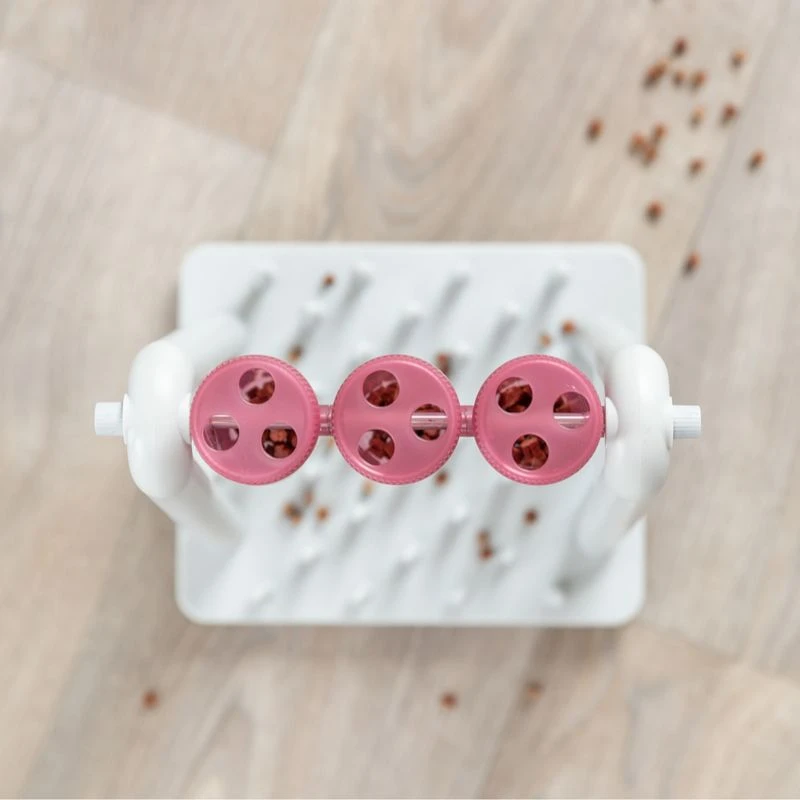 You can hide treats or dry food in the cup and on the base plate with the pegs. When the cup is rotated, the treat falls into pegs at the bottom and has to be teased out.