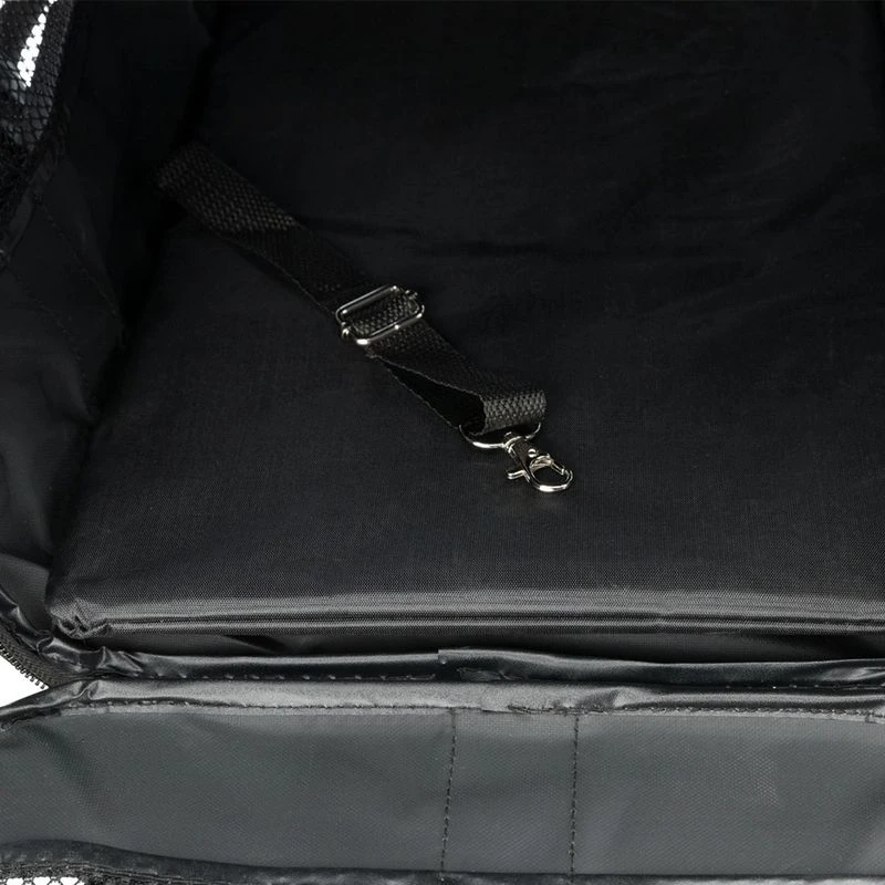 The bag is closed with zippers and can be opened from the top and the side (the short side of the bag can be opened). A solid shelf ensures stability. It can be fastened with snaps so that it doesn’t slip. When not in use, the base can be removed to easily wipe down the plastic cover. A practical side pocket offers space e.g. B. for vaccination certificates, medication or treats.