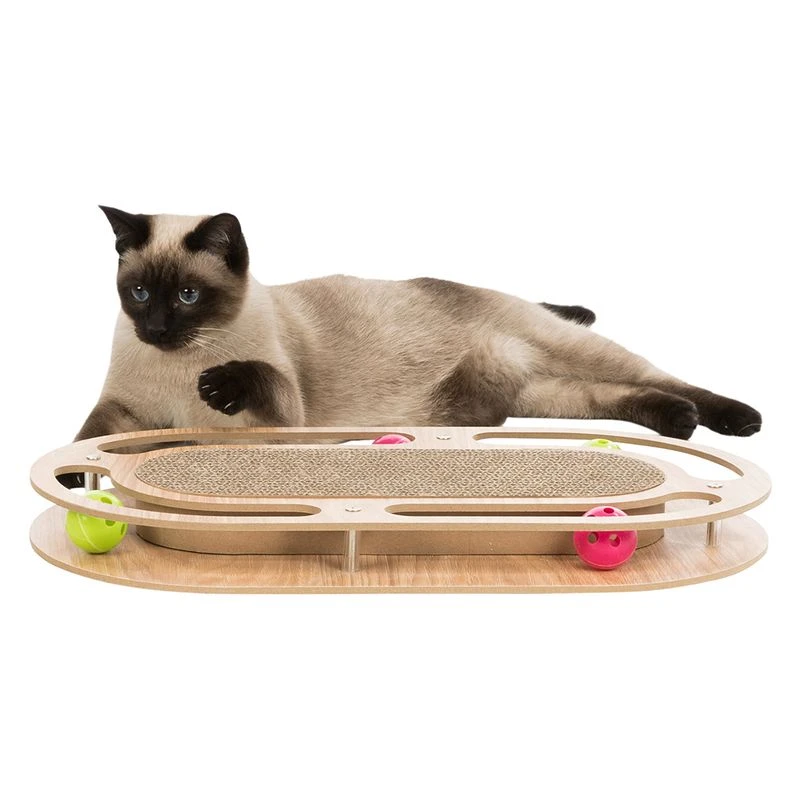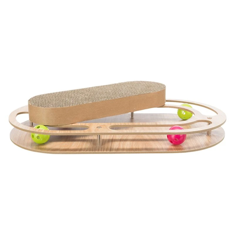 The Trixie scratching pad with oval wooden frame not only looks exciting, it also offers lots of variety! Your pet can enjoy sharpening its claws on the replaceable scratching board. In the 4 ball tracks, colourful balls roll around merrily and make the little bells inside ring. To further animate your cat, you can sprinkle the included cat nip over the scratching board.