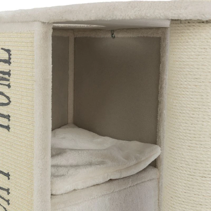 The scratching furniture with scratching barrel in attractive cream is equipped with a spacious house for hiding, sleeping and retreating. It is cosily lined with plush and fleece to create a feel-good atmosphere. Tucked away behind the front of the house is a further lying area that cannot be seen from the front. There is also a cosy bed with a border at the top, which is perfect for snoozing and observing the territory. A wide scratching area at the front and extra thick sisal trunks are available for your velvet paw to scratch – ideal conditions for daily claw care.