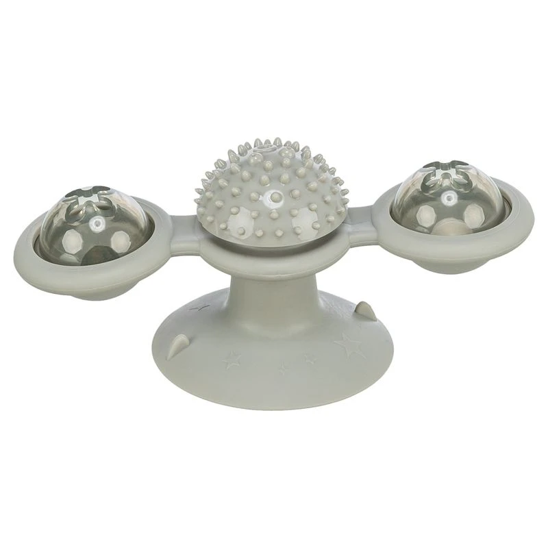 The two balls on the sides are filled with a clip or a ball of cat nip and can be opened by you if necessary. The nubby ball in the middle of the window top, which can also be turned, is ideal for scratching and rubbing.